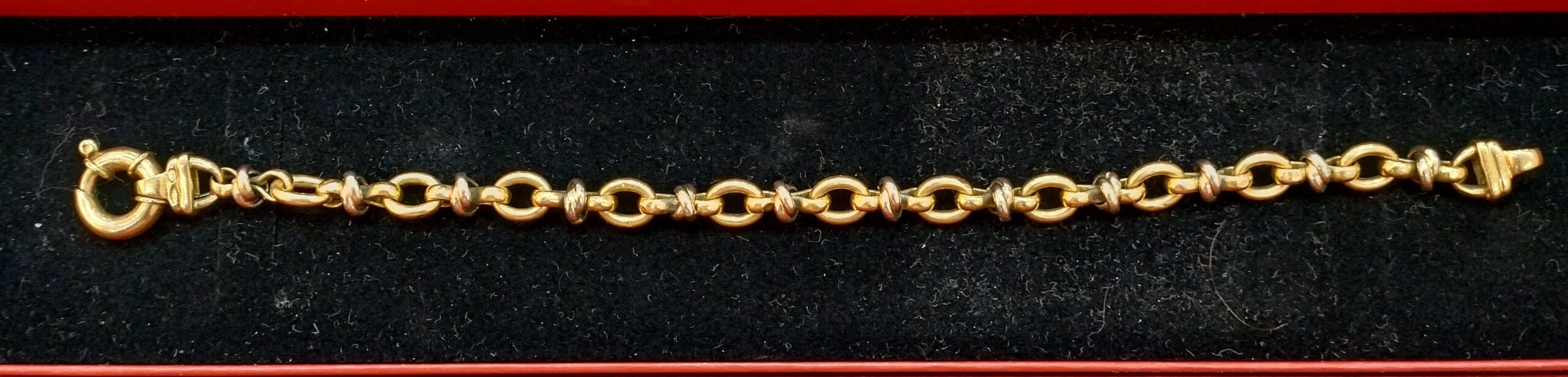 La chaîne est terminée par un fermoir mousqueton/anneau ressort en or jaune 18k, massif et sécurisé, assurant une fermeture fiable. Le polissage est soigné sur l’ensemble du bracelet.